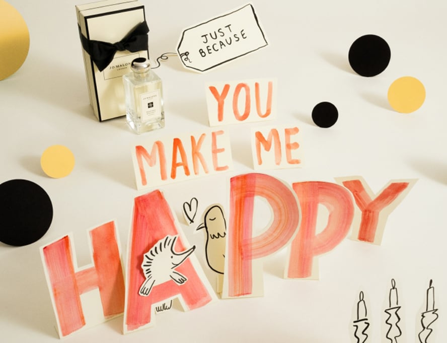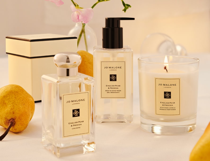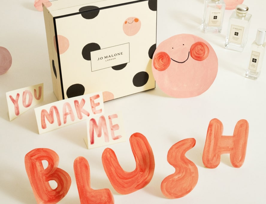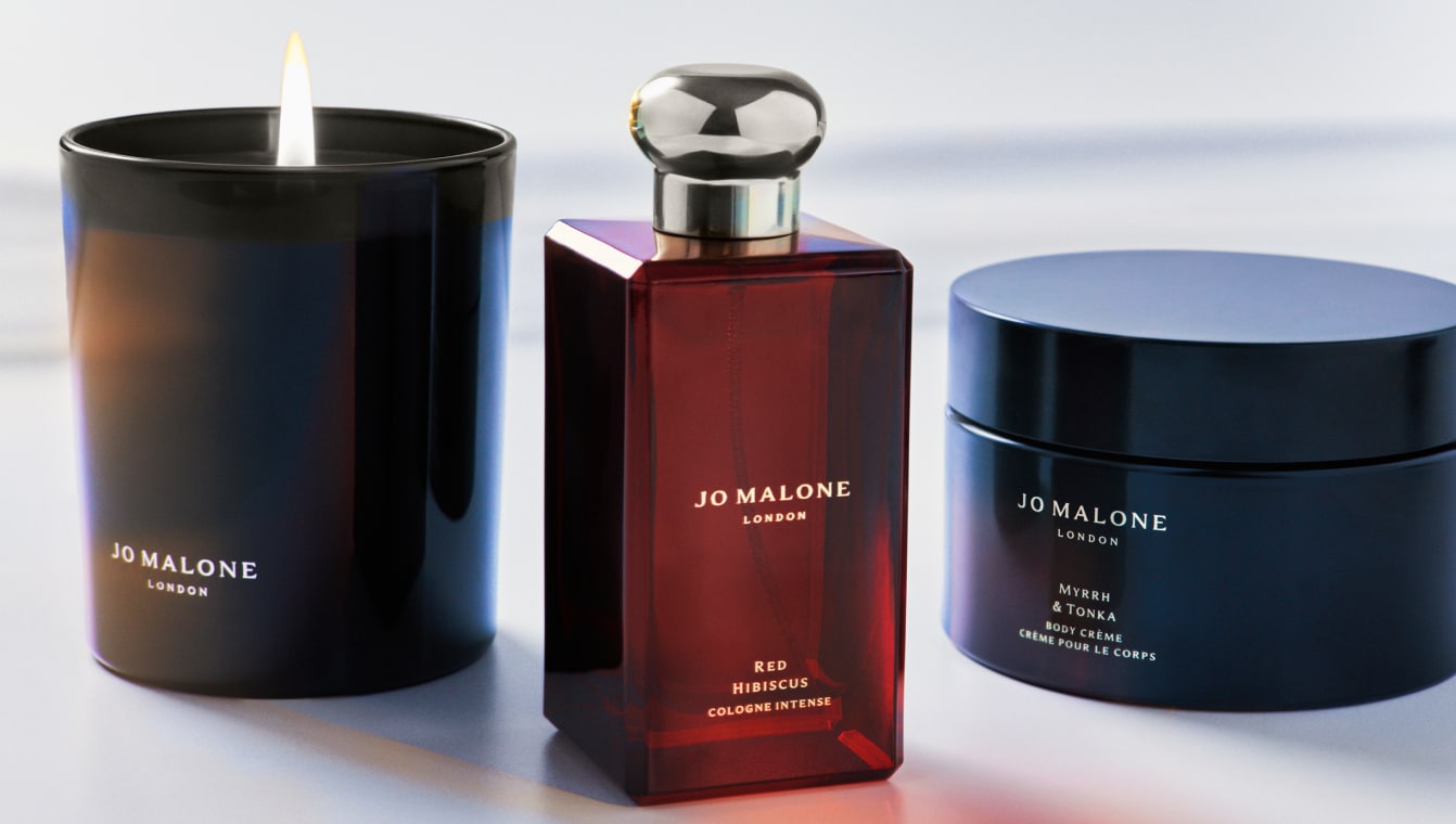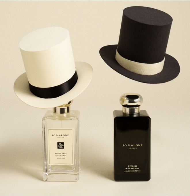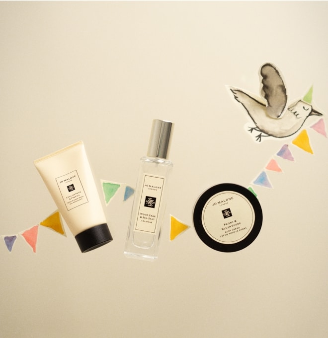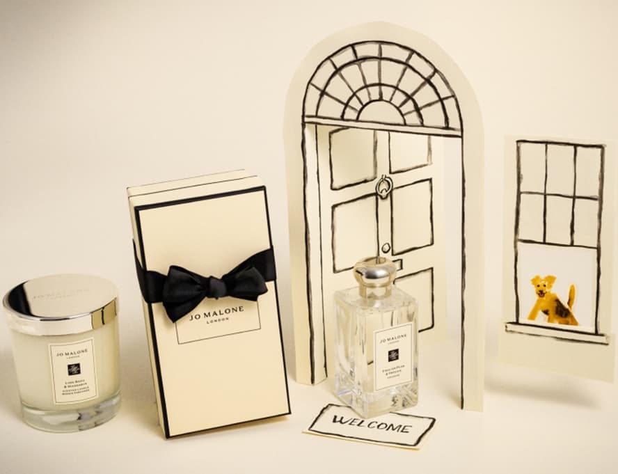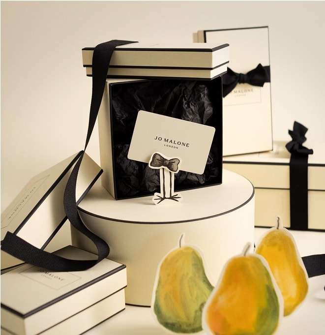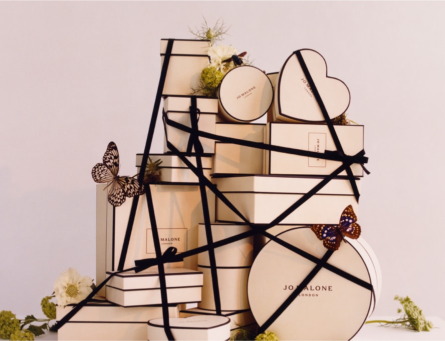 mulher sentada em uma colina, segurando caixas de presente clássicas jo malone london preto e creme