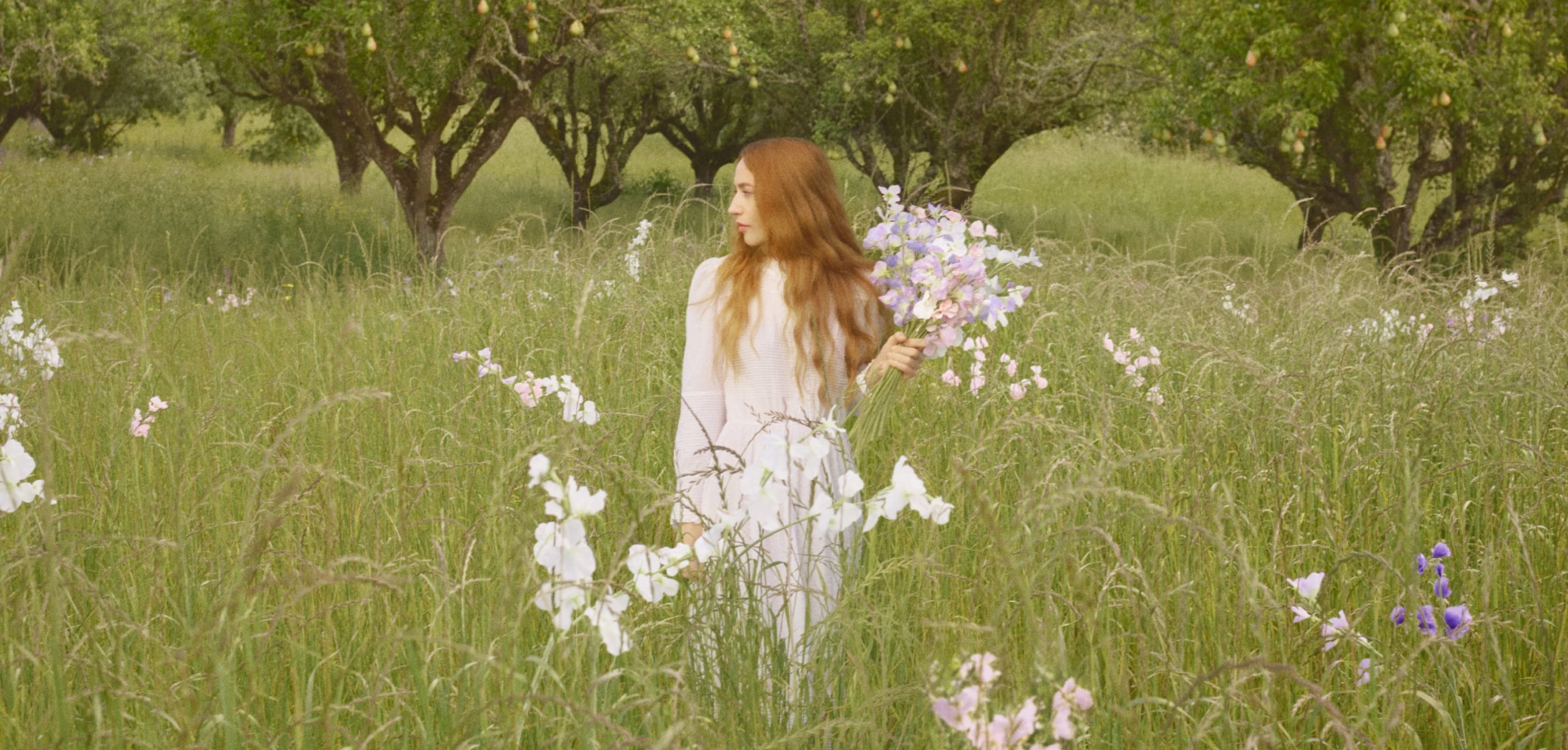 Perfume é, inevitavelmente, sobre memória – e para Georgia May, também sobre ritual. “É uma parte tão importante de se sentir pronta para sair”, diz ela. “Também penso nas fragrâncias que minha mãe usava ou no cheiro dos amigos. Você sente um aroma e ele te leva para um lugar ou um momento.” Para Lizzy, a conexão é literal: “Eu realmente amo ervilhas-de-cheiro. Minha mãe as cultiva e, quando vamos à casa dela, ela espalha pequenos buquês por toda parte.” Ela também as associa à irmã: “O cheiro de ervilha-de-cheiro me faz lembrar da Georgia May, porque é a flor favorita da nossa mãe e passamos muito tempo perto delas.” Para Céline, English Pear & Sweet Pea foi o segundo capítulo natural da coleção English Pear. “Queríamos reinterpretar a pera por meio de outra flor. As ervilhas-de-cheiro são alegres e em tons pastel, e as frésias são elegantes e alongadas. Para mim, as duas flores pareciam irmãs.”